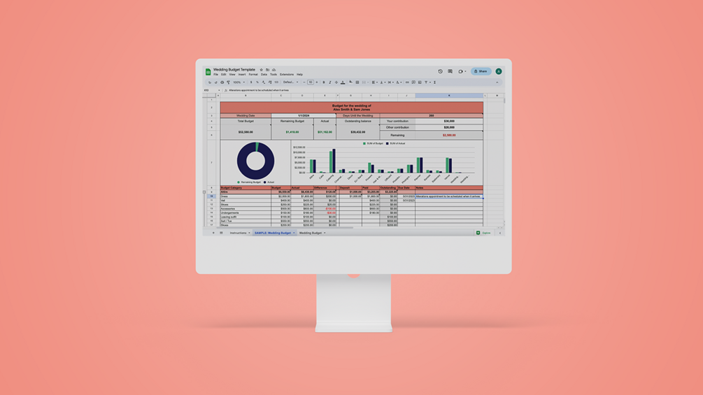 Whether you're a tech-savvy planner or a first-time budgeter, our template is designed to meet your needs. Track your budget across 16 common main categories in this pre-populated template, including their deposits, due dates, and actual costs. We've included all the essential wedding expenses you'll need to budget for, from the venue and catering to the dress and photographer. We've also included instructions for easy customization. Our template is perfect for keeping track of all your expenses in one place and saves you the time of building it yourself.